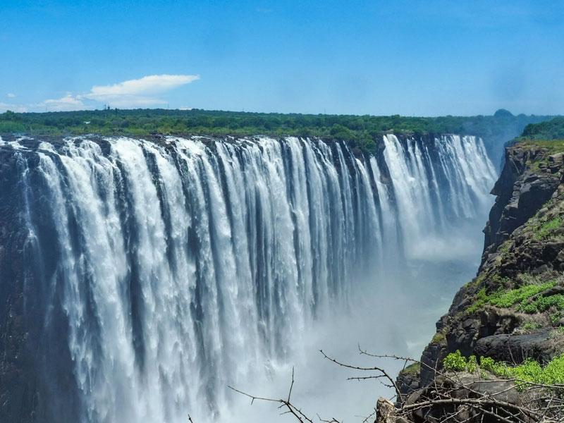 Victoria Falls is one of the seven natural wonders of the world, which is a part of the mighty Zambezi River, located on the border between Zimbabwe and Zambia. Victoria Falls hits a ledge of basalt rock and falls in a powerful whirlpool, forming the largest sheet of water. The roar of water falling from such a high waterfall can sometimes be heard from 40 kilometers (25 miles) away. A bright cloud in the form of mist is seen floating above the falls. It is truly an amazing sight. This waterfall is included in the UNESCO World Heritage.